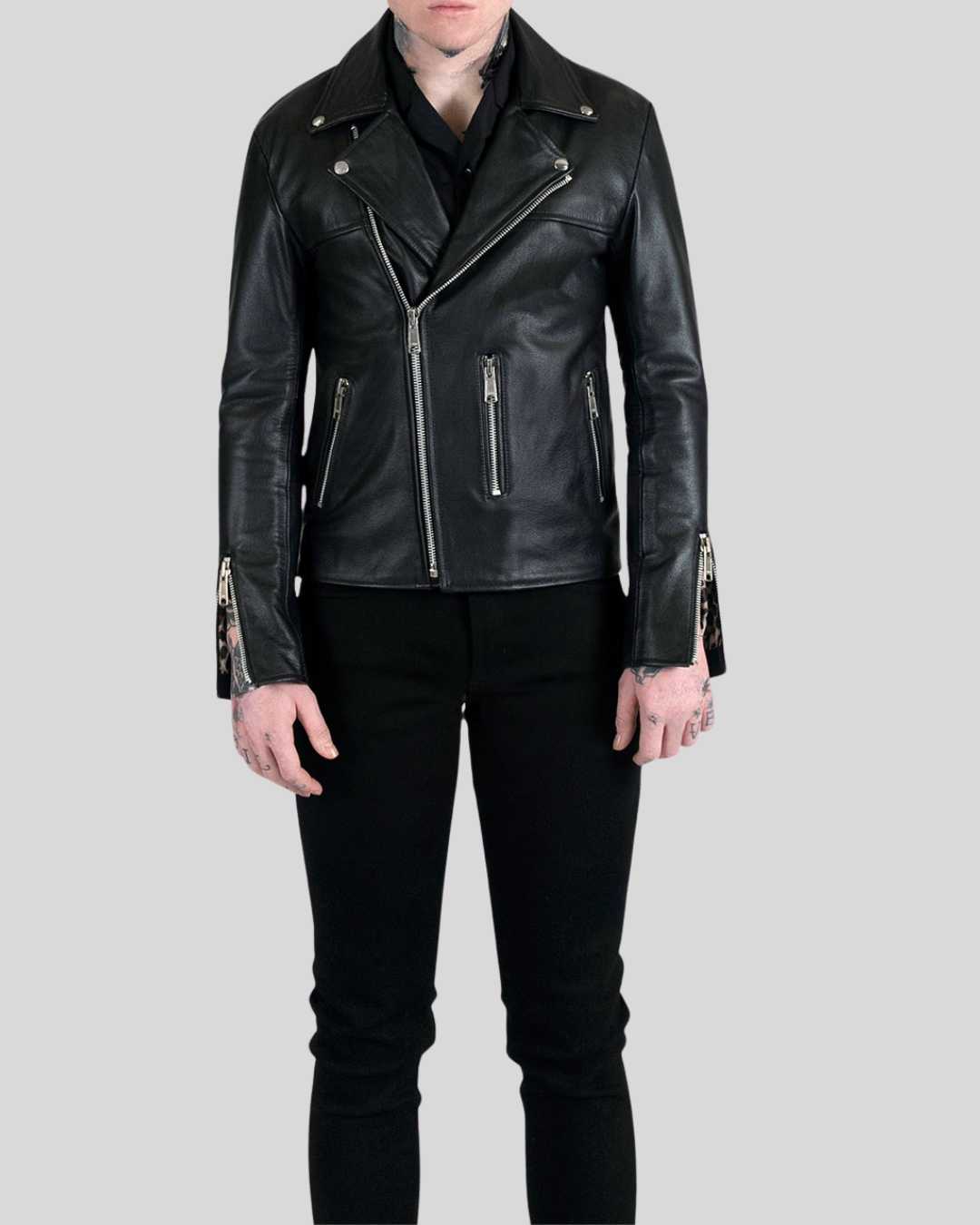 This men’s leather jacket is expertly crafted from premium genuine leather, offering a smooth texture, rich finish, and lasting durability. Designed with a modern tailored fit, it contours naturally to the body while allowing comfortable movement. The jacket features a full-length front zipper, a structured collar, and precision stitching that highlights its refined craftsmanship.